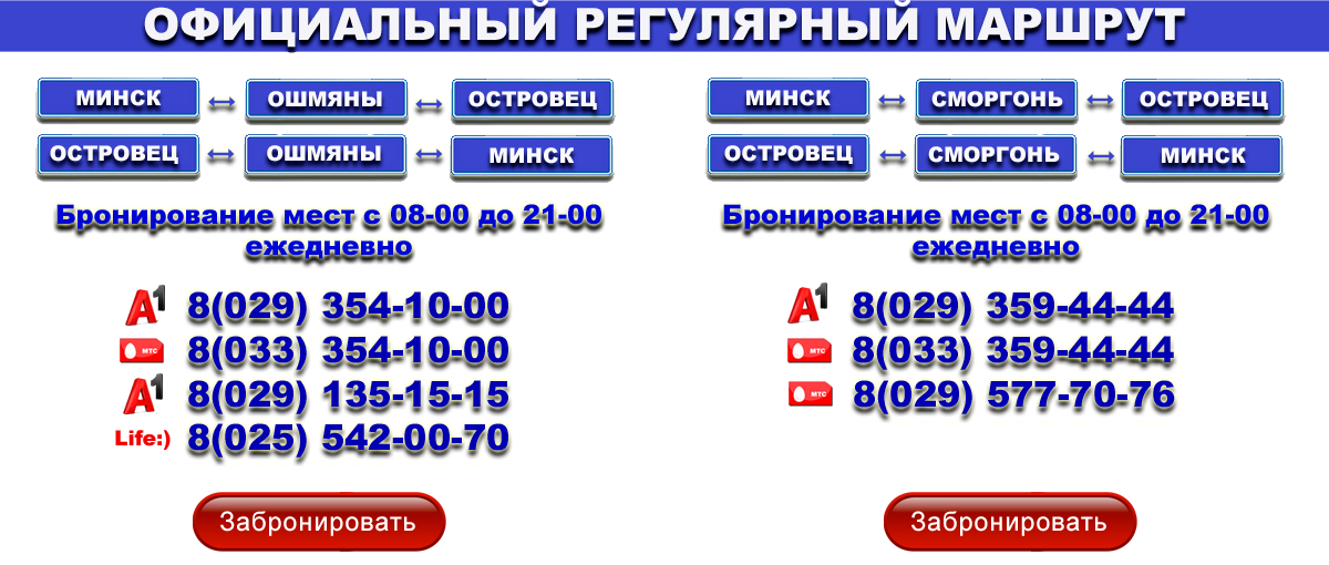 Минск - Островец 22 руб. Минск - Ошмяны 17 руб. Минск - Сморгонь 17 руб.
